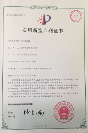 恭賀我公司產(chǎn)品礦用裝藥器于2017年5月3日再次獲得國家專利證書 專利證號(hào):ZL 2016 2 1185302.1