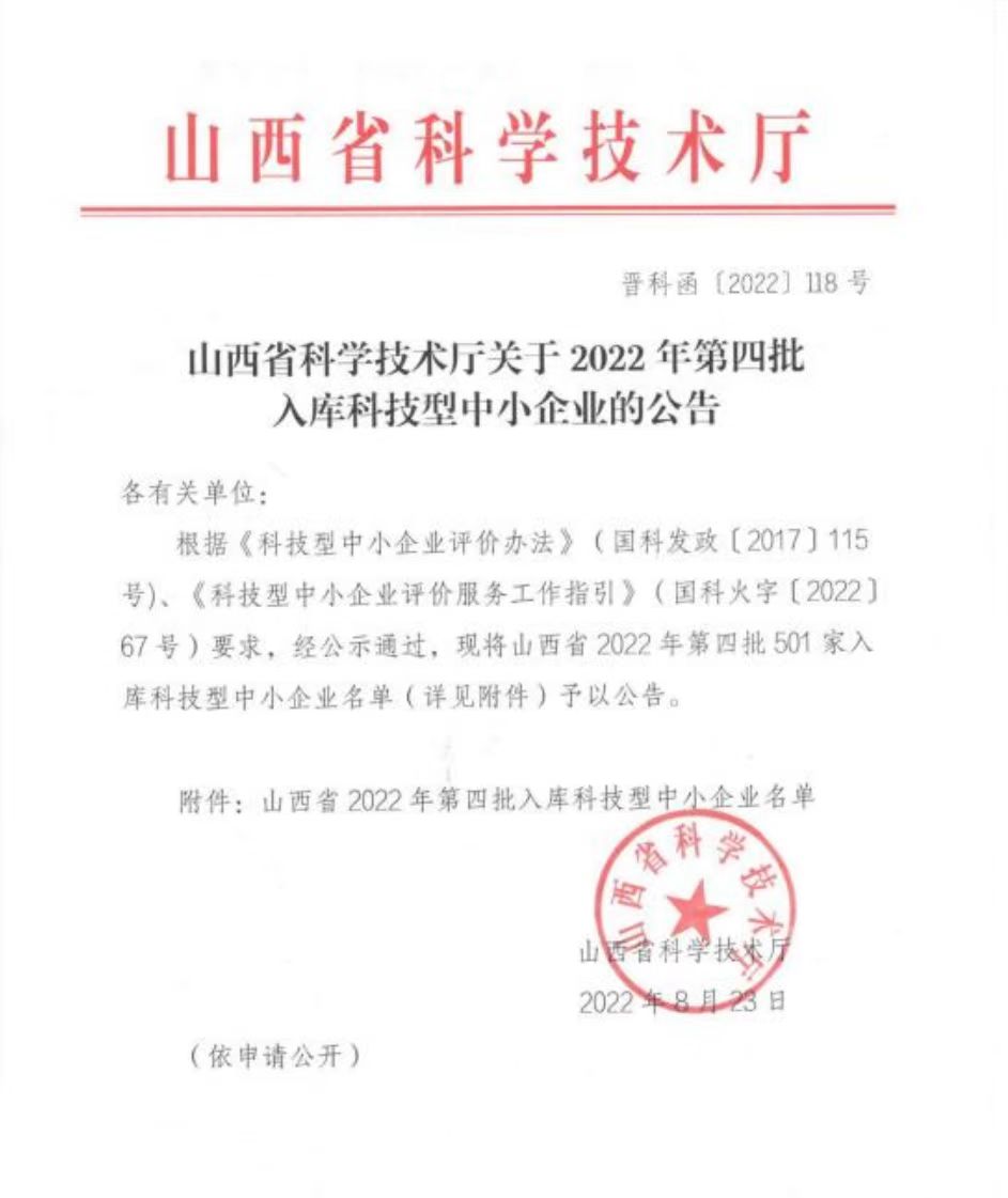 根據(jù)《科技型中小企業(yè)評(píng)價(jià)辦法》(國(guó)科發(fā)政[2017]115號(hào))、《科技型中小企業(yè)評(píng)價(jià)服務(wù)工作指引》(國(guó)科火字[2022]67號(hào))要求,經(jīng)公示通過(guò),我公司入庫(kù)2022年第四批科技型中小企業(yè)。
