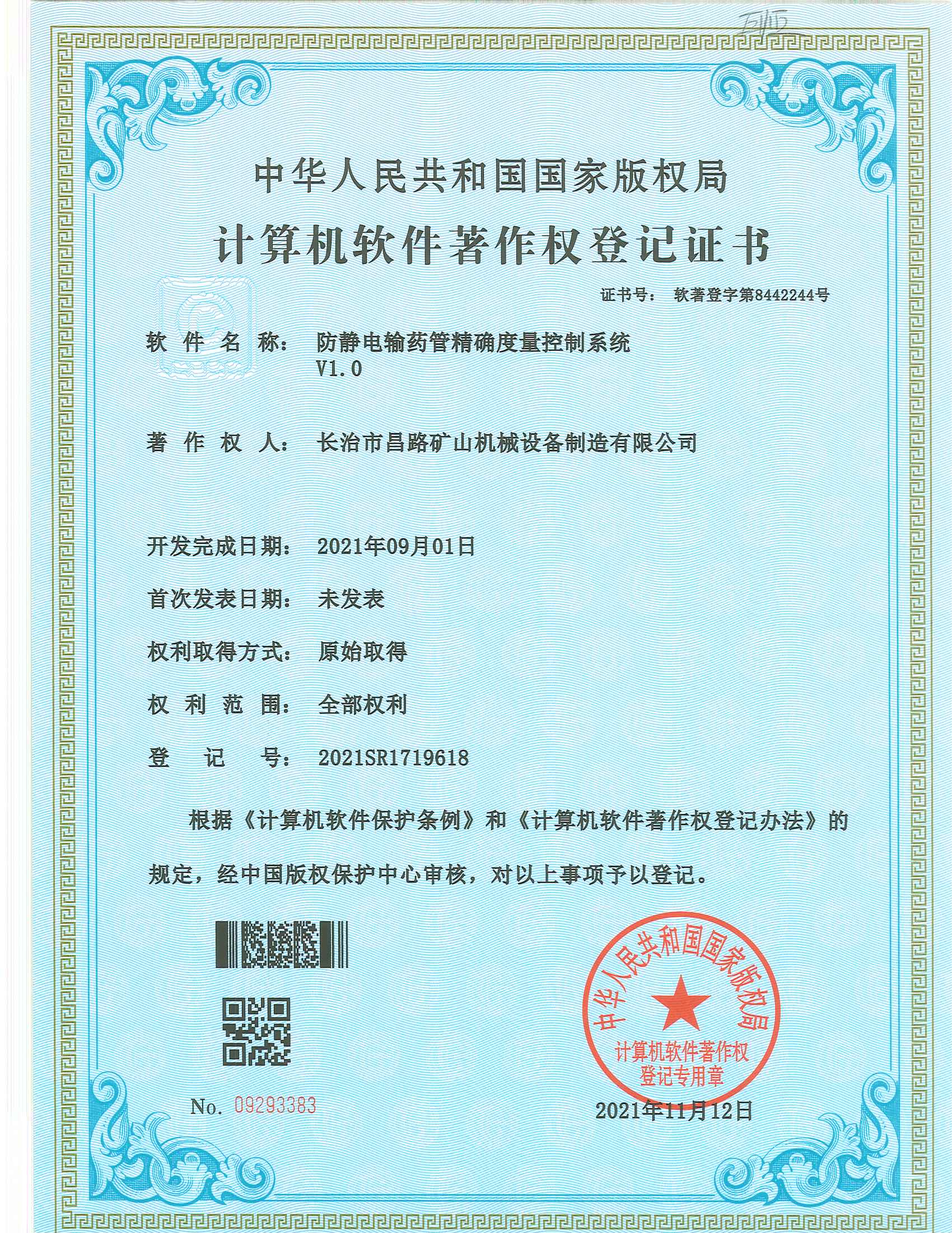 防靜電輸藥管精確量控制系統(tǒng)著作權(quán)登記證書